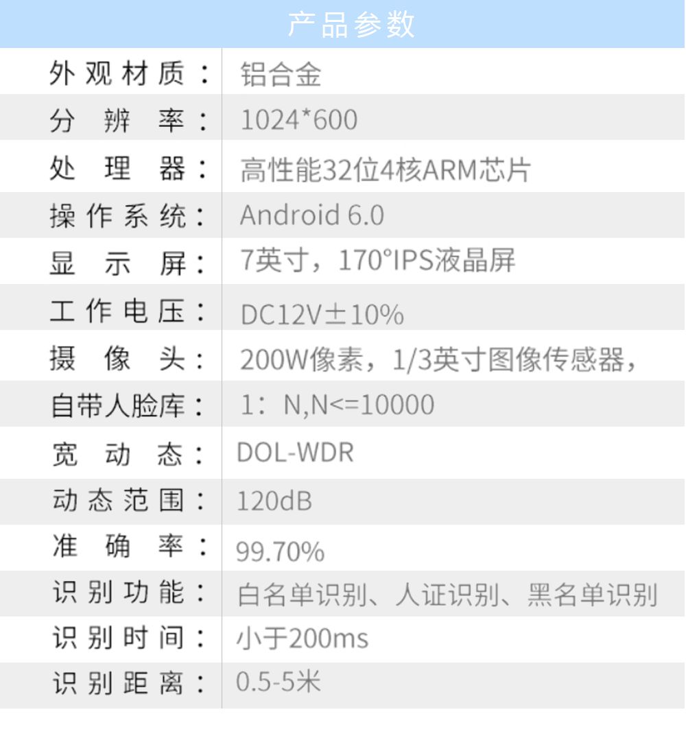 ● 高容量:标配10000张人脸容量、100000条记录,最大支持50000张人脸